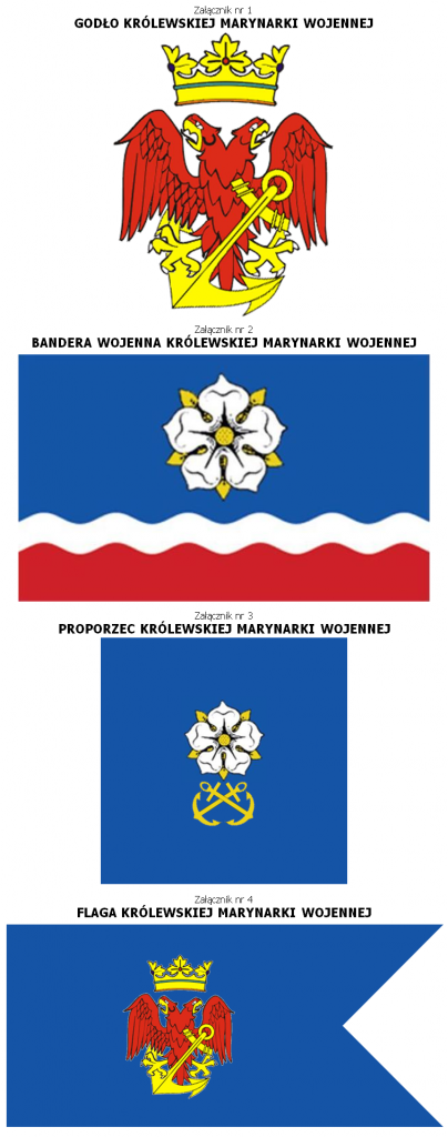IV. Proporzec Królewskiej Marynarki Wojennej stanowi kwadratowa flaga barwy niebieskiej, na której znajduje się pięciopłatkowy kwiat a pod nim dwie skrzyżowane kotwice. Wzór proporca stanowi załącznik nr 3 do niniejszego postanowienia.