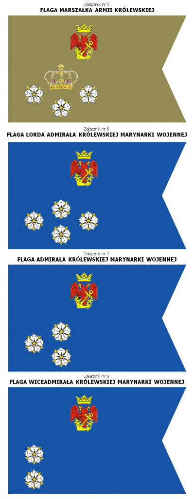 (3) Flagę morską Marszałka Armii Królewskiej, jeżeli na pokładzie okrętu wojennego przebywa Marszałek Armii Królewskiej. Flagę Marszałka Armii Królewskiej stanowi prostokątna flaga o stosunku długości boków 5 do 3 z wycięciem w kształcie trójkąta rozwartokątnego, barwy niebieskiej z godłem Królewskiej Marynarki Wojennej pośrodku w górnej części flagi oraz trzema pięciopłatkowymi kwiatami ułożonymi razem z koroną u szczytu, w kształt rombu znajdującego się w dolnej lewej części flagi. Wzór flagi stanowi załącznik nr 5 do niniejszego postanowienia,